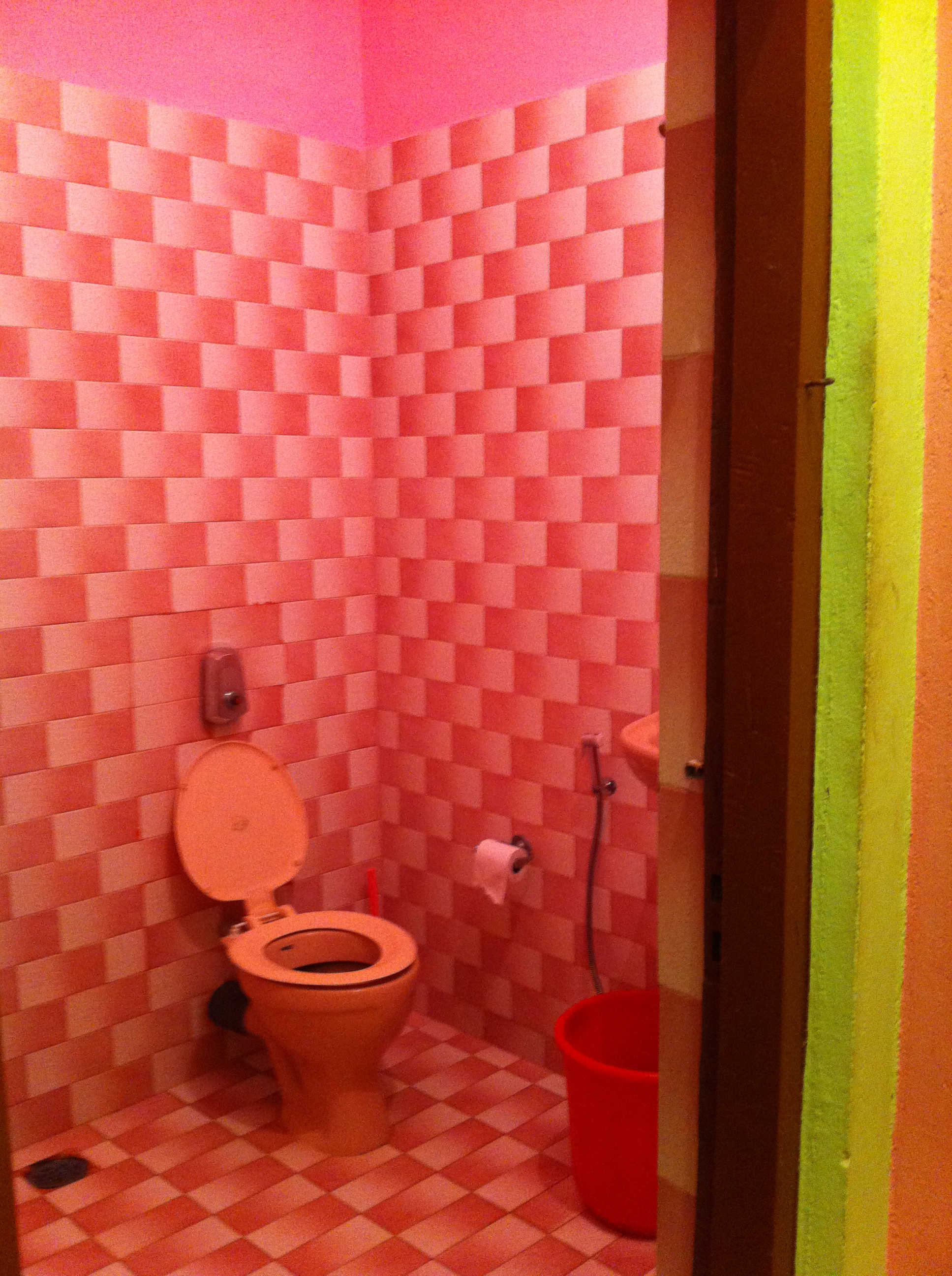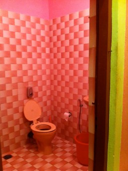 February 18, 2012Adventure, India Leave a comment India: Bright Pink And I thought brown shag carpet in the bathroom made a statement – this one you can’t miss even with your eyes closed. Oh, and that green, that is the bedroom color. What can I say, Goans love to keep things vibrant! 15.043763 73.985758 Share this: Click to share on LinkedIn (Opens in new window) LinkedIn Click to email a link to a friend (Opens in new window) Email Click to share on X (Opens in new window) X Click to share on Facebook (Opens in new window) Facebook Click to print (Opens in new window) Print Click to share on Pinterest (Opens in new window) Pinterest Like Loading... Related BathroomsIndia
