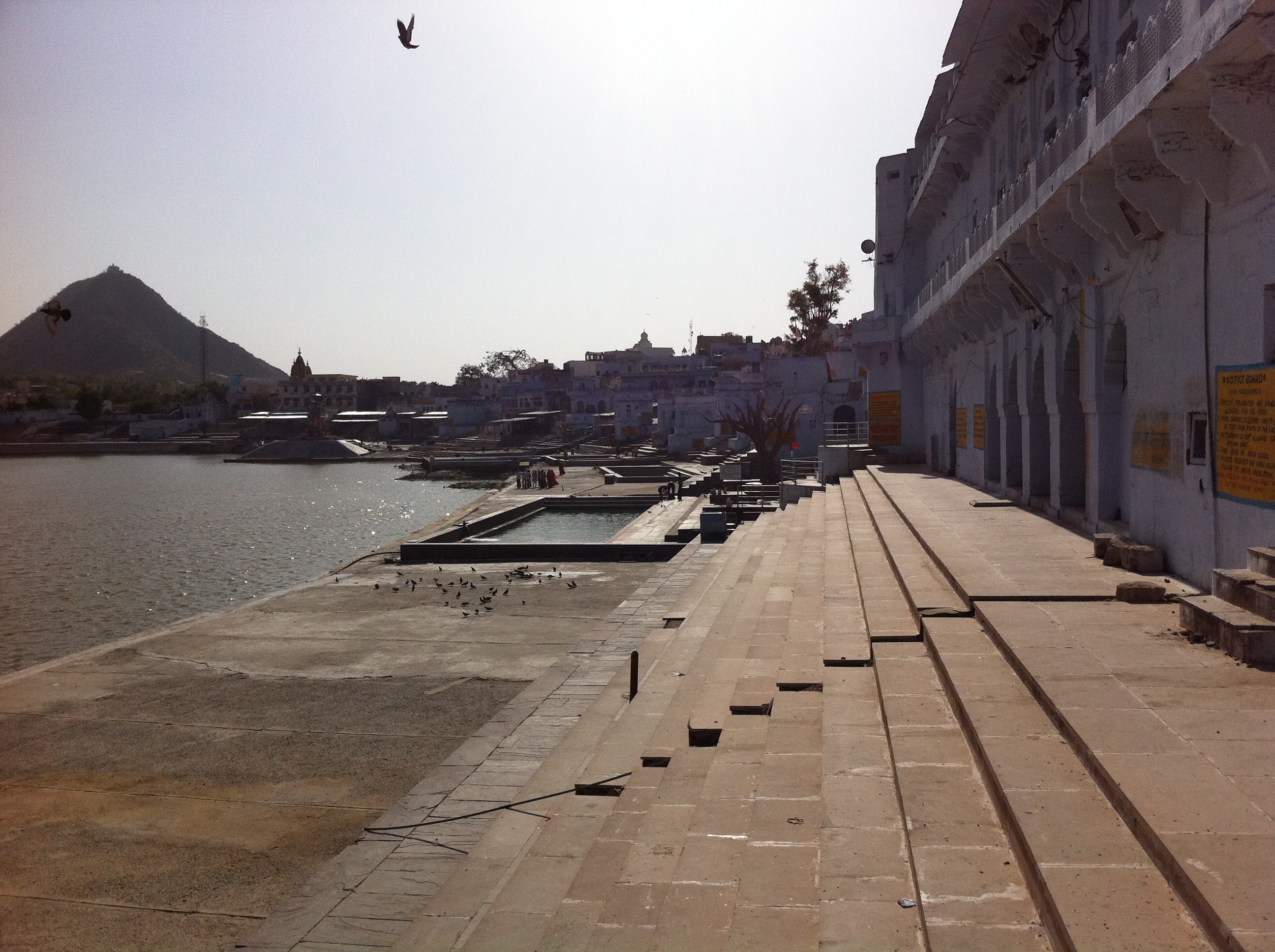 We had one full day in the holy city of Pushkar. How did it go? As any good day in India should go, full of the unexpected. This morning, the unexpected was salty coffee. (Those super fine granules at the bottom of the sugar bowl that we thought were just crushed sugar cubes – not sugar.) This afternoon, the unexpected was a Hindu prayer by one of the holiest bodies of water in India.